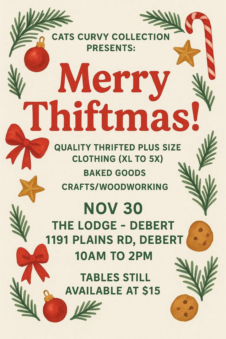 Cats Curvy Collections presents Merry Thriftmas on Sunday, November 30th from 10am to 2pm at The Lodge, 1191 Plains Road, Debert. Quality thrifted plus size clothing (XL to 5X), baked goods, crafts/woodworking. Tables still available at $15.