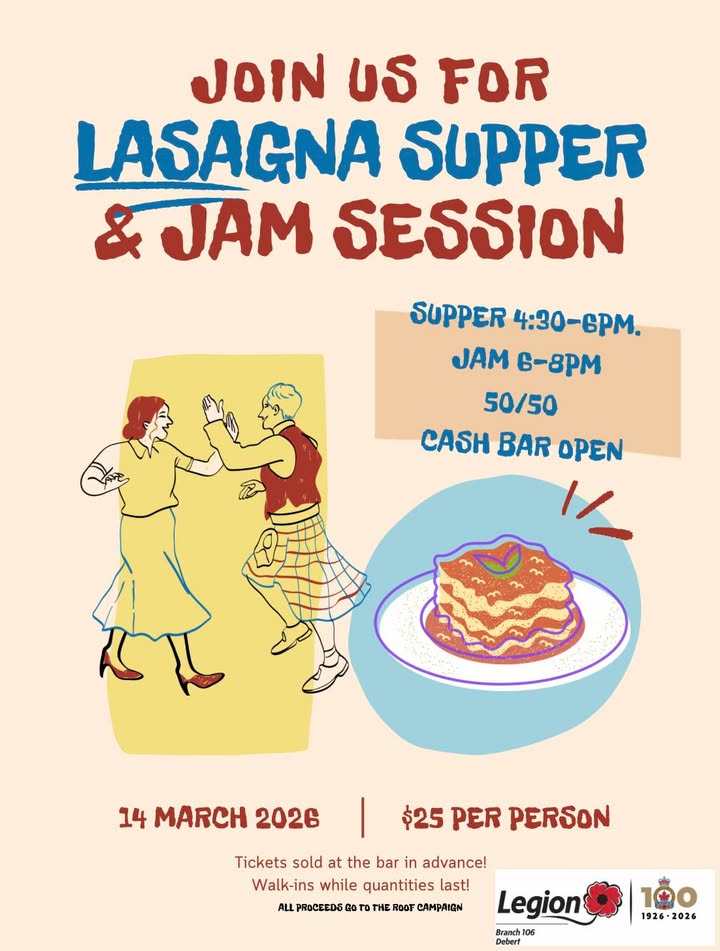 Lasagna Supper & Jam Session at the Debert Legion Branch 106, 1252 Masstown Road, Debert on Saturday, March 14th from 4:30 to 6pm, Jam from 6-8pm. The cost is $25 per person. Tickets sold at the bar in advance. Walk-ins while quantities last. All proceeds to the Legion Roof campaign.
