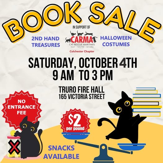 CARMA Cat Rescue Meow Mixer Fundraiser on Saturday, September 13th from 10am to 2pm at the Truro Fire Hall. There will be second hand treasures, vendor booths, bake sale, ice cream, snacks and carnival style games. Want to be included in our vendors sales? Tables are $20 each. Book yours now.