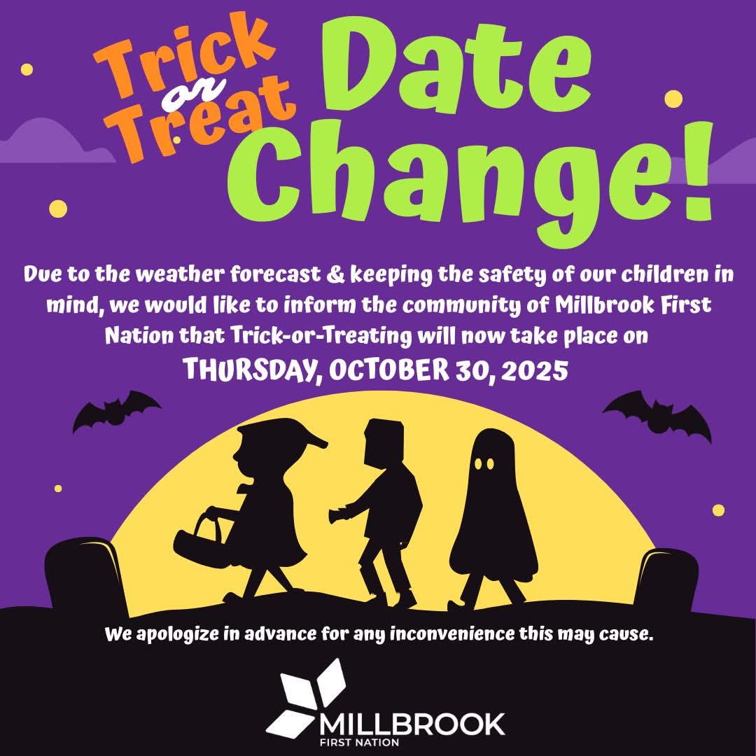 Due to the weather forecast and keeping the safety of our children in mind, we would like to inform the community of Millbrook First Nation that the Trick or Treating will now take place on THURSDAY, OCTOBER 30TH.